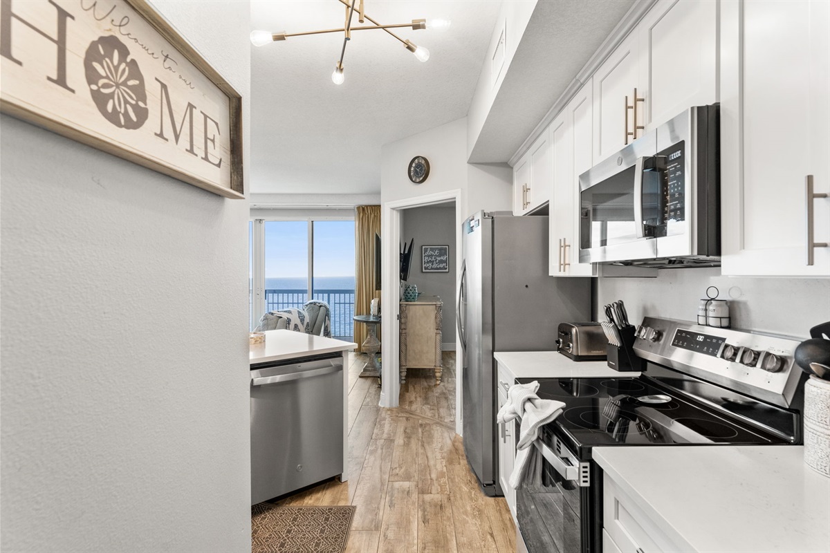 The fully equipped kitchen is ready for family meals or snacks after the beach, featuring granite counters, stainless steel appliances, a coffee maker (brew & pods), Ninja blender, countertop griddle, toaster, and cabinets stocked with cookware, bakeware, and serving essentials.